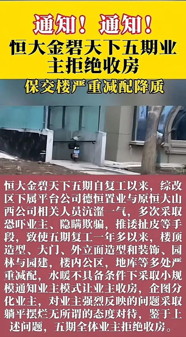 在去年10月,恒大金碧天下5期业主就因为楼顶造型、大门、外立面造型、装饰、园林、楼内公区、地库等问题拒绝收房。