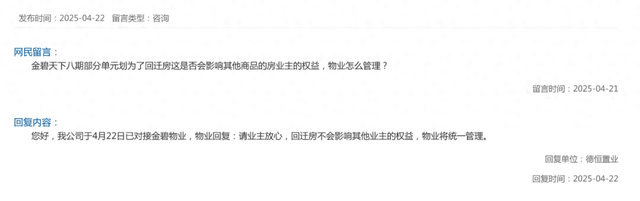 综改区官网德恒置业也进行了回复,表示:我公司于4月22日已对接金碧物业,物业回复:请业主放心,回迁房不会影响其他业主的权益,物业将统一管理。