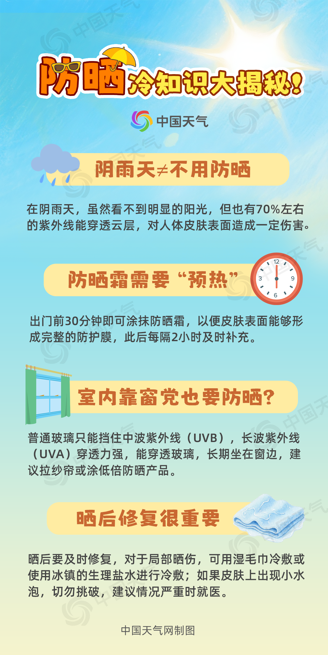 18日,西北地区大部和河北、河南北部、山东等地紫外线强,午后外出,需注意全方位防御;南方大部地区的紫外线相对弱一些,如要外出,也需适当涂抹点防晒霜。