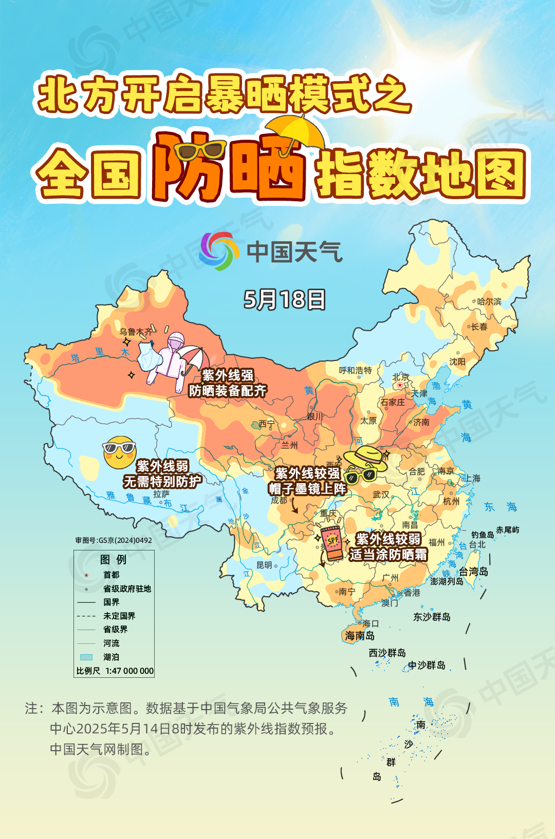 从全国防晒指数地图中可以看出,15日,新疆大部、内蒙古中西部、甘肃、河北、北京、天津、辽宁中西部和湖北、云南西北部等地以晴为主,户外紫外线强烈,防晒霜、遮阳帽、墨镜、防晒服等装备都可以用起来,主打一个“全方位遮阳”;而安徽、江苏、江西北部、四川西部、西藏中东部、黑龙江东部等地受降雨影响,紫外线弱,无需特别防护,若长期在户外,建议涂抹低倍防晒护肤品。